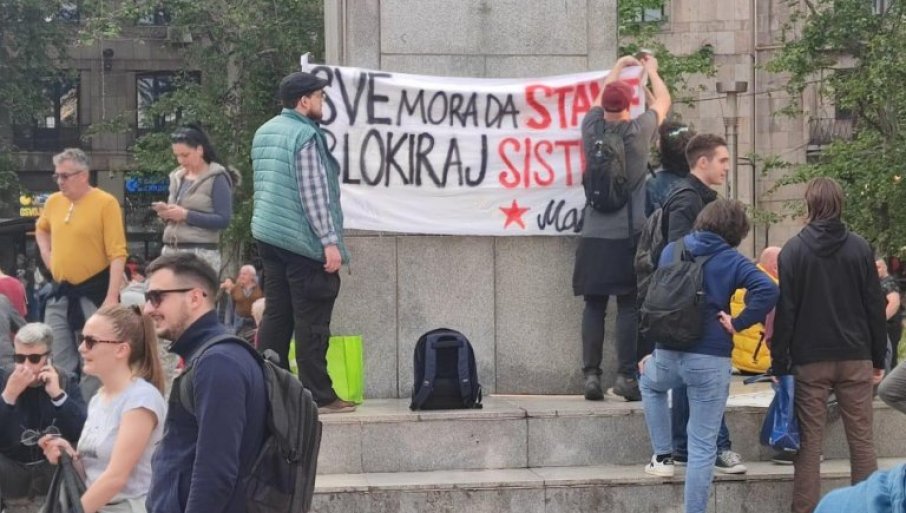 Na protestu su i aktivisti ultra-levičarske organizacije "Marks 21" sa transparentom sa natpisom "Sve mora da stane, blokiraj sistem".
