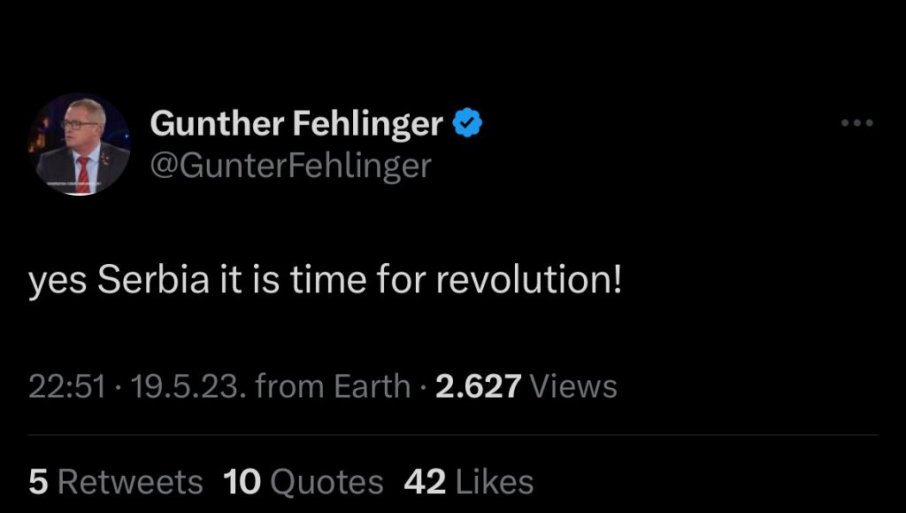 AUSTRIJSKI ekonomista Ginter Felinger, albanski lobista i predsednik nevladinih organizacija za proširenje NATO-a, putem "Tvitera" je uputio sramni poziv na revoluciju u Srbiji.