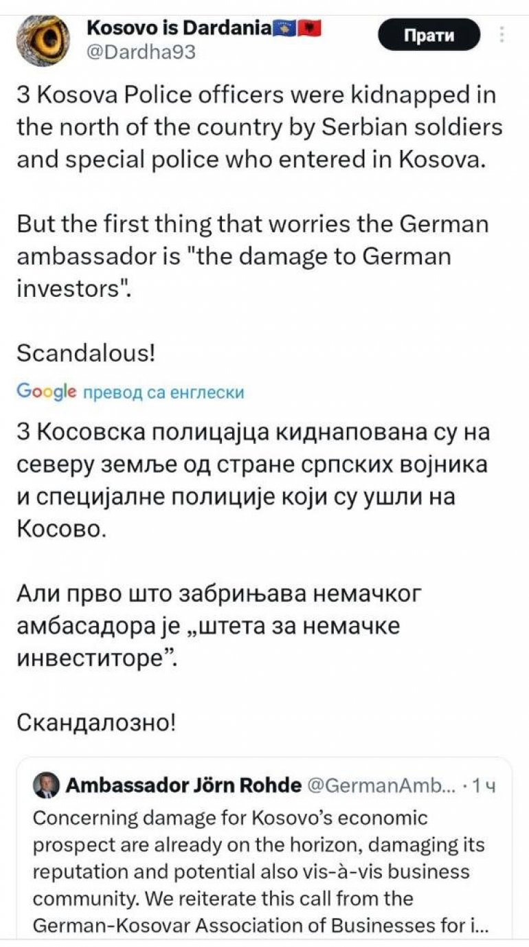 Naime, oni Rodea na Tviteru prozivaju zbog, kako kažu, "skandalozne" izjave o šteti za nemačke investitore zbog nesmirivanja tenzija na Kosovu i Metohiji, izazvanih jednostranim potezima i provokacijama Aljbina Kurtija.