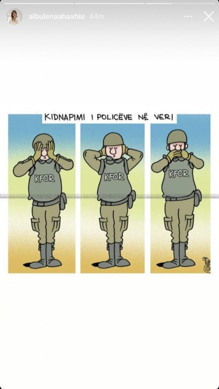 Hadžiju je na društvenoj mreži Instagram podelila karikaturu kojom ismeva KFOR zbog istrage o slučaju Kurtijevih terorista koji su uhapšeni na teritoriji Republike Srbije.