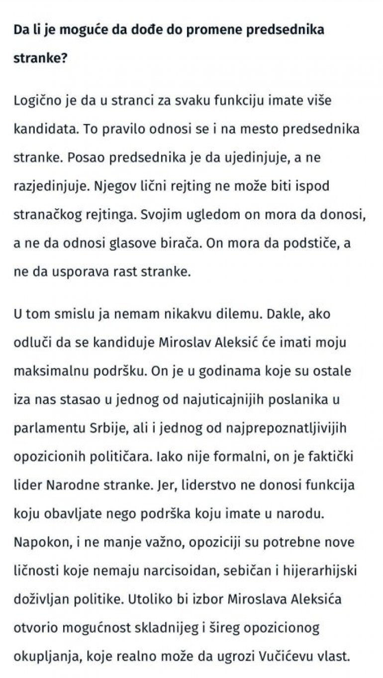 - Logično je da u stranci za svaku funkciju imate više kandidata. To pravilo odnosi se i na mesto predsednika stranke. Posao predsednika je da ujedinjuje, a ne razjedinjuje. Njegov lični rejting ne može biti ispod stranačkog rejtinga. Svojim ugledom on mora da donosi, a ne da odnosi glasove birača. On mora da podstiče, a ne da usporava rast stranke - rekao je, između ostalog, Novaković.