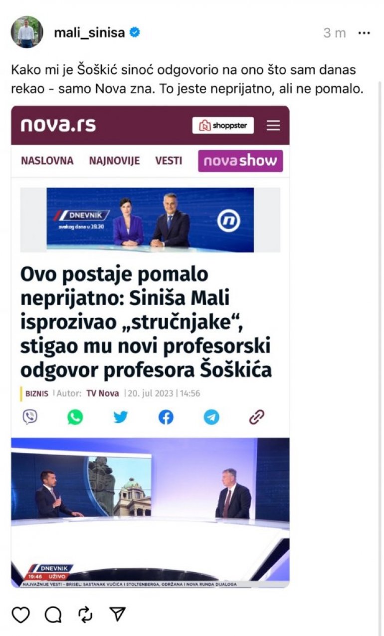 - Kako mi je Šoškić sinoć odgovorio na ono što sam danas rekao - samo Nova zna. To jeste neprijatno, ali ne pomalo - napisao je Mali na društvenoj mreži Treds.