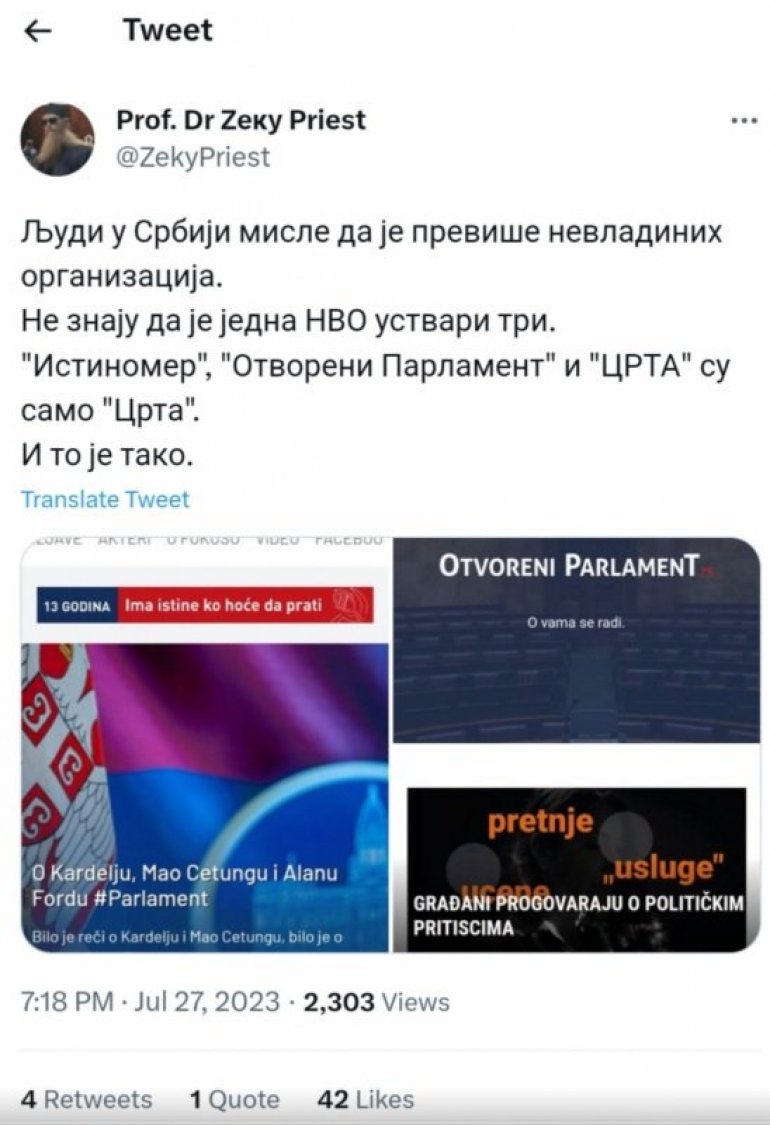 - Ljudi u Srbiji misle da je previše nevladinih organizacija. Ne znaju da je jedna NVO ustvari tri. "Istinomer", "Otvoreni Parlament" i "CRTA" su samo "Crta". I to je tako - tvrdi korisnik Tvitera pod imenom Zeky Priest.
