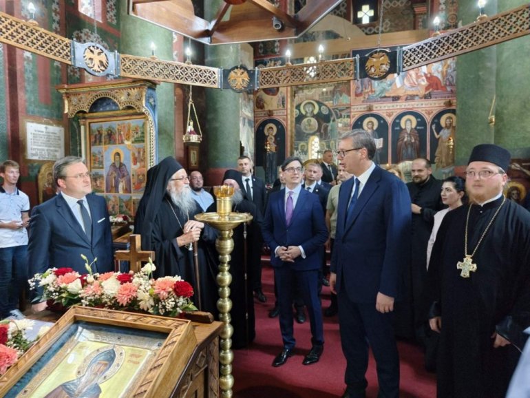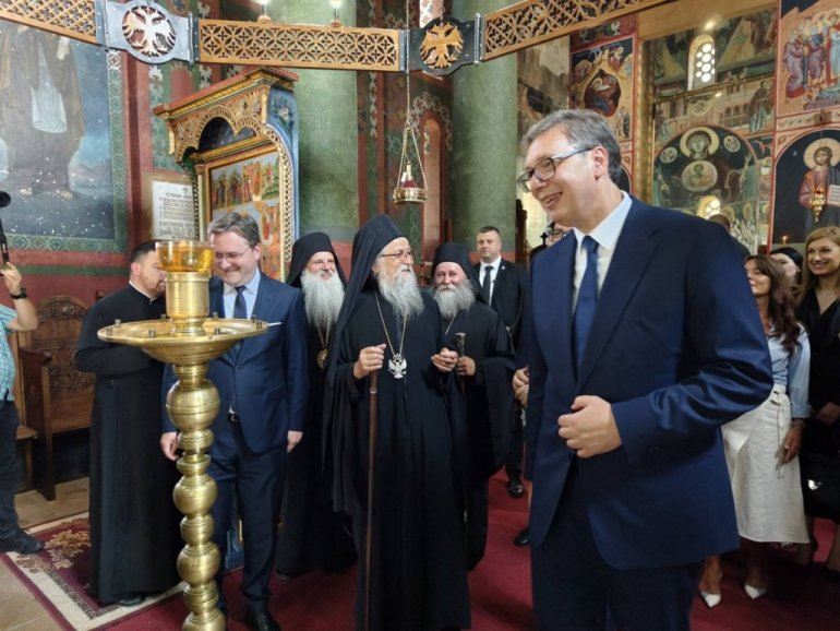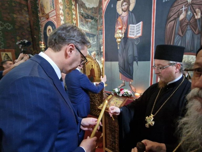 - Mnogo sam srećan što danas možemo da budemo gosti u prelepom manastiru, da potvrdimo izuzetne odnose koji postoje među nama. Ja sam stvarno bio oduševljen kada sam jutros video ovde ljude iz Makedonije. Nemam problem da kažem - mi smo ne samo prijatelji, već kao narodi imamo bratske odnose, ili sestrinske, pošto je još lepše tako reći, ali verujem da će se ti odnosi i dalje razvijati. Nemamo otvorenih pitanja. Verujem da ćemo uvek pričati o važnim stvarima i jačati ekonomsku saradnju i jačati životni standard. Naša trgovinska razmena je 1, 5 milijardi evra na godišnjem nivou. Mnogo toga zajednički radimo da poboljšamo životni standard građana obe zemlje. Sada razgovaramo i o spajanju kada su u pitanju železnice. Hoću da se zahvalim i na istorijskim odlukama koje je srpska crkva donela na dobrobit naših naroda - kazao je Vučić, koji je čestitao veliki praznik Ilindan građanima u Srbiji, a građanima Severne Makedonije Ilinden - Dan Republike.