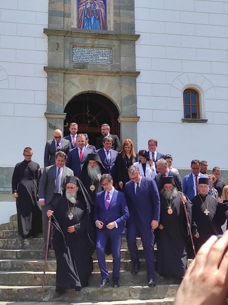 Vučića i Pendarovskog su u manastiru dočekali vladika vranjski Pahomije i arhimandrit Metodije, koji je iguman manastira. Pendarovski je položio venac kod spomen česme u porti manastira.