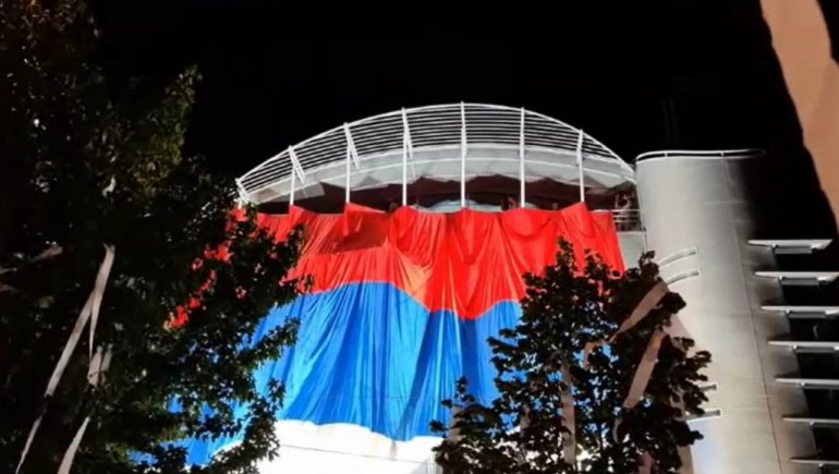 Preko zgrade Pinka vlasnik te televizije Željko Mitrović postavio je zastavu Srbije.