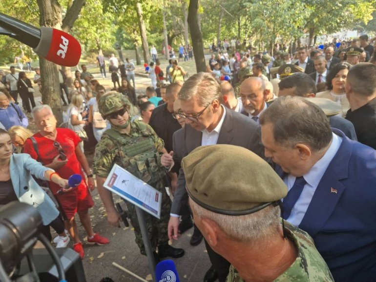 Vučiću su prilazili građani i deca da ga pozdrave i slikaju se sa njim. Na današnjem prikazu izložen je velik broj borbenih i neborbenih sistema, brojno naouružanje, vojna oprema, kao i proizvodi srpske odbrambene industrije.
