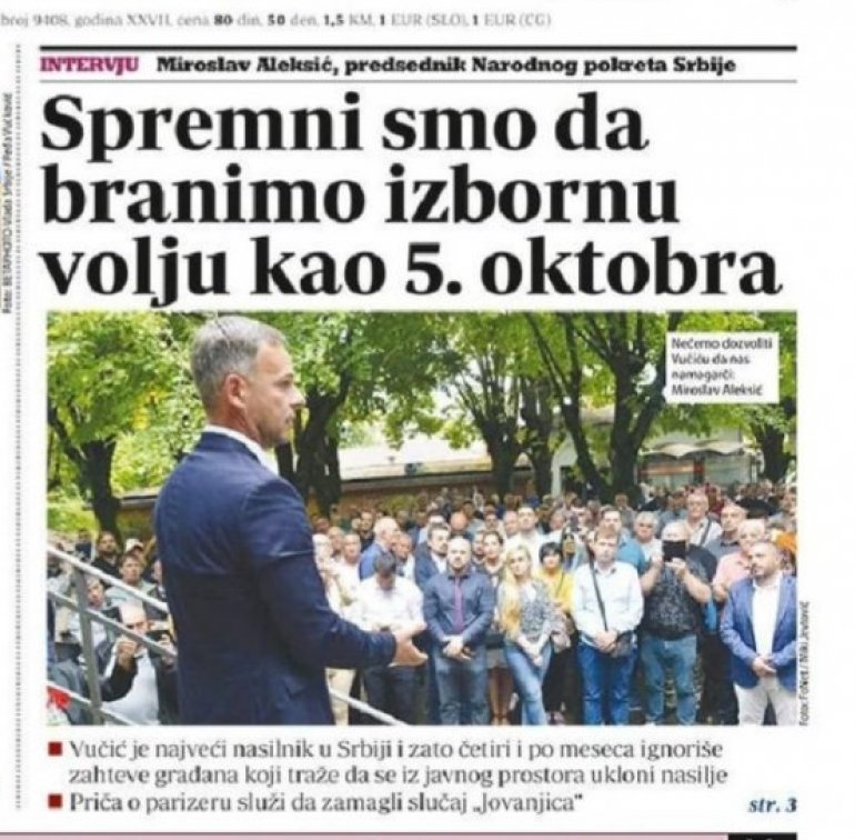 Naime, u opozicionom dnevnom listu "Danas" osvanula je naslovna strana na kojoj je napisana Aleksićeva izjava koja glasi: "Spremni smo da branimo izbornu volju kao 5. oktobra".