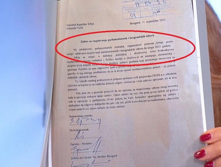 "Mi, predstavnici parlamentarnih stranaka, organizatori protesta 'Srbija protiv nasilja', zahtevamo raspisivanje parlamentarnih i beogradskih izbora do kraja 2023. godine".