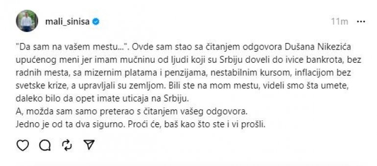 - "Da sam na vašem mestu...". Ovde sam stao sa čitanjem odgovora Dušana Nikezića upućenog meni jer imam mučninu od ljudi koji su Srbiju doveli do ivice bankrota, bez radnih mesta, sa mizernim platama i penzijama, nestabilnim kursom, inflacijom bez svetske krize, a upravljali su zemljom. Bili ste na mom mestu, videli smo šta umete, daleko bilo da opet imate uticaja na Srbiju. A, možda sam samo preterao s čitanjem vašeg odgovora. Jedno je od ta dva sigurno. Proći će, baš kao što ste i vi prošli - poručio je Mali na društvenoj mreži Treds.