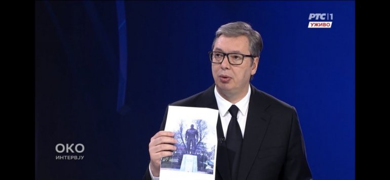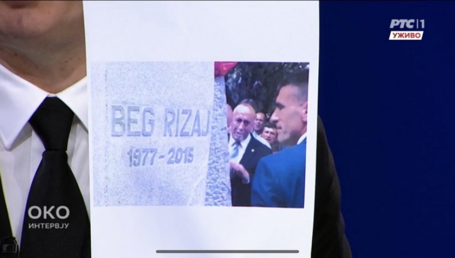 - Ovo je Beg Rizaj, jedan od ubijenih terorista, a ovo je spomenik podignut njemu u Dečanima čuvenim. Spomenik obilazi i polaže sveće Ramuš Haradinaj. Toliko o njihovim principima, evrospkoj budućnosti i svemu drugom - rekao je Vučić.
