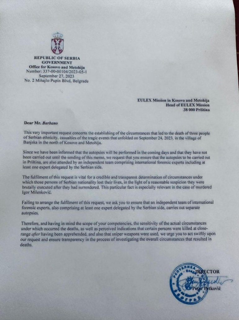 "Obraćamo vam se sa veoma bitnim zahtevom povodom utvrđivanja okolnosti smrti tri lica srpske nacionalnosti, koji su život izgubili u tragičnim događajima od 24. septembra 2023. godine u mestu Banjska na severu Kosova i Metohije.