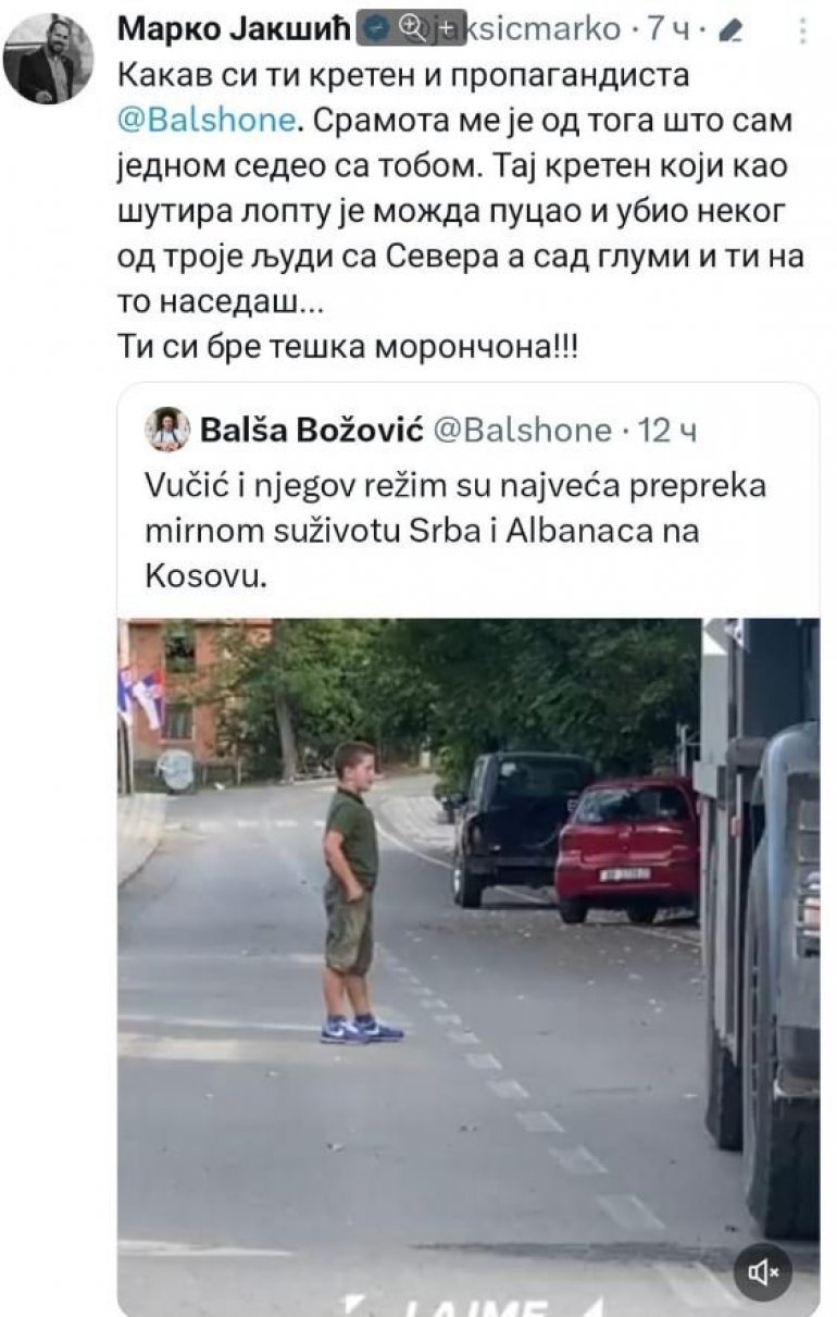 - Kakav si ti kreten i propagandista. Sramota me je od toga što sam jednom sedeo sa tobom. Taj kreten koji kao šutira loptu je možda pucao i ubio nekog od troje ljudi sa Severa a sad glumi i ti na to nasedaš... Ti si bre teška morončona!!! Foto: Printskrin