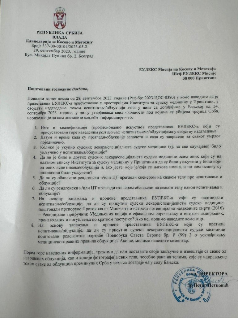Povodom vašeg pisma od 28. septembra 2023. godine (Ref.br: 2023-COS-0380) u kome navodite da je predstavnik EULEKS-a prisustvovao u prostorijama Instituta za sudsku medicinu u Prištini u svojstvu nadgledanja, tokom ispitivanja/obdukcija tela u vezi sa događajima u Banjskoj od 24. septembra 2023. godine, u cilju utvrđivanja svih okolnosti pod kojima su ubijena trojica Srba, neophodno je da nam dostavite sledeće informacije i to: