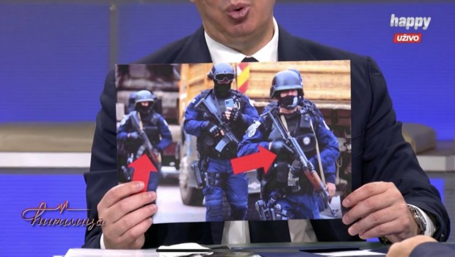 PREDSEDNIK Srbije Aleksandar Vučić pokazao je u emisiji Ćirilica fotografije koje dokazuju da pripadnici tzv. kosovske policije koriste puške proizvedene u Kragujevcu.