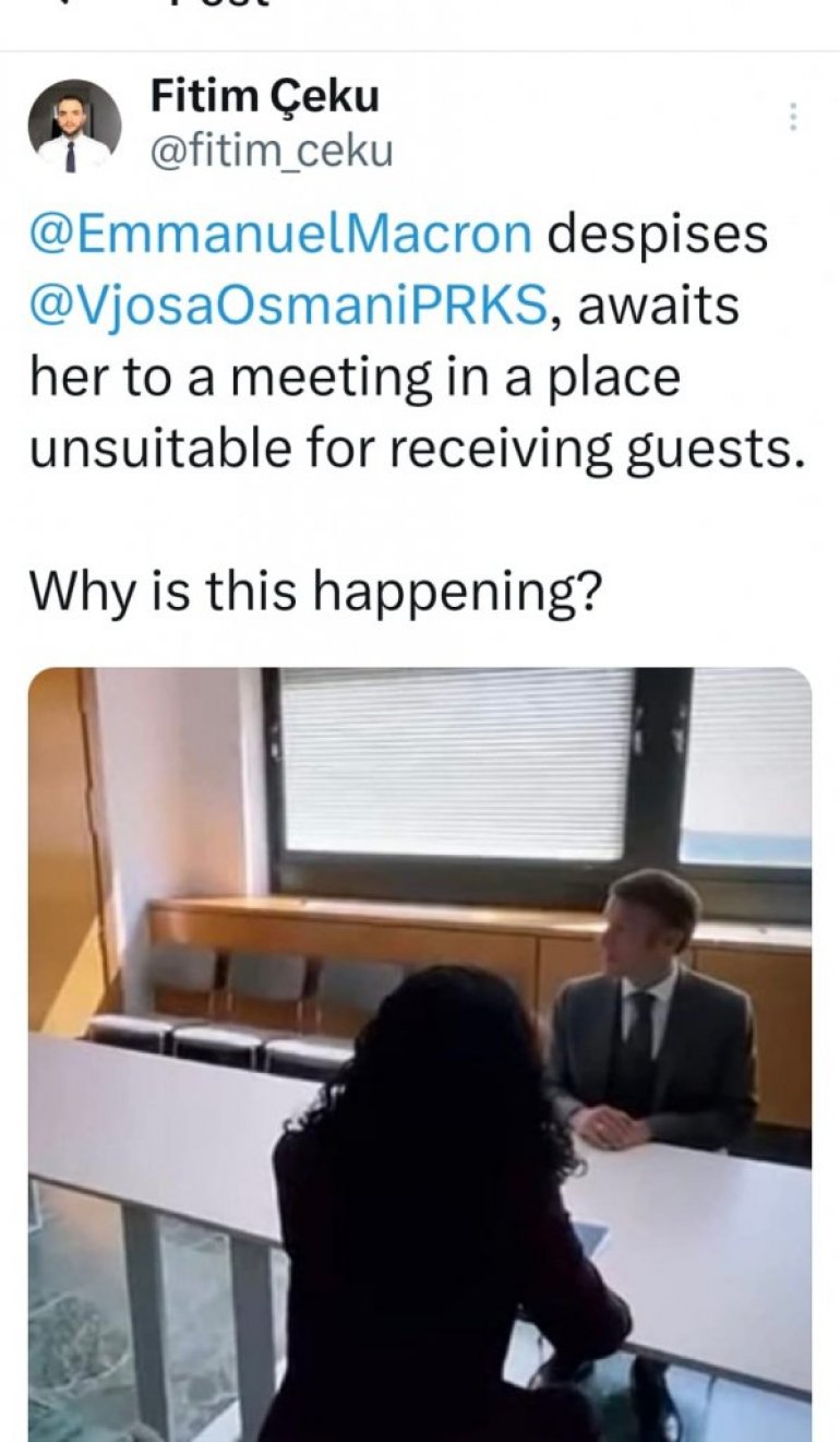- Francuski predsednik Emanuel Makron pokazao je prezir prema kosovskoj predsednici Vjosi Osmani, primivši je na sastanak u prostoriji neprikladnoj za prijem visokih zvaničnika - napisao je Čeku na platformi X (Tviter), zapitavši se zašto se to događa.