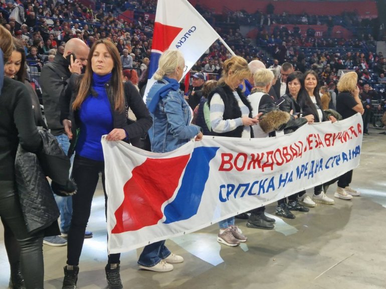 Više puta tokom govora predsednik je morao da prekine, jer je cela Arena odzvanjala "Aco Srbine", "Srbija" i "Kosovo je srce Srbije".