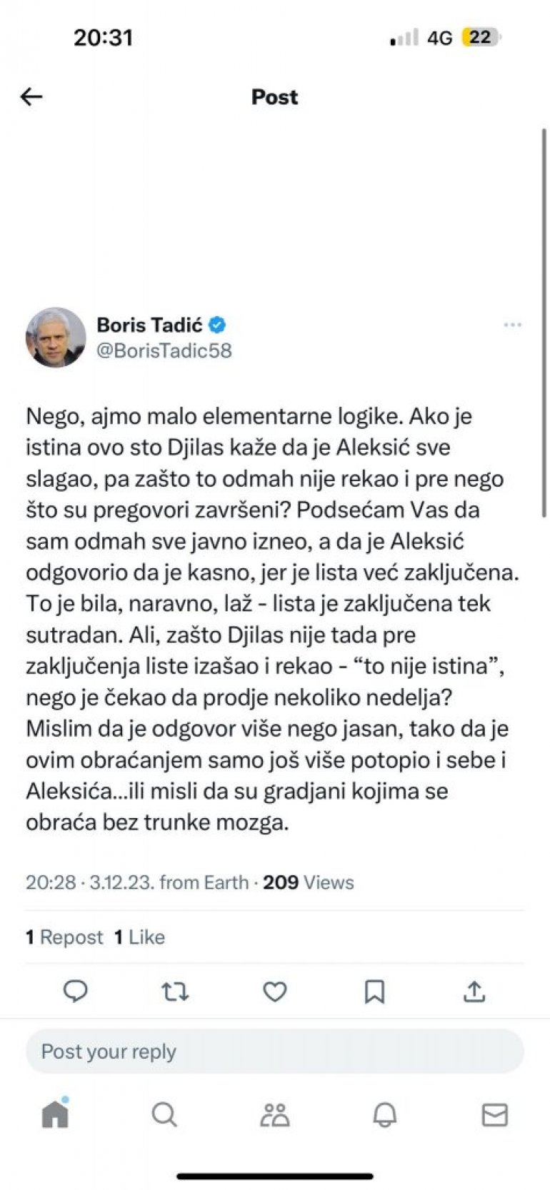 Dakle, ovim si optužio nosioca svoje liste da je lažov koji je sprečio sabiranje opozicionih glasova. I ok, to rešite među sobom. A meni si mogao kao čovek da odgovoriš na poziv, a ne kao političar u kampanji da mi pišeš sarkastična pisma.