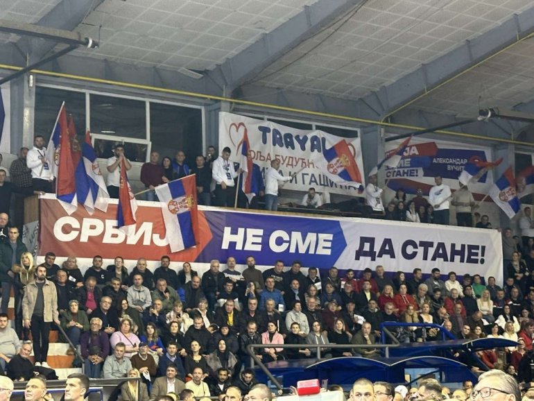 Hala sportova ispunjena je do poslednjeg mesta, a velikim aplauzom dočeaki su Miloš Vučević i Ana Brnabić.