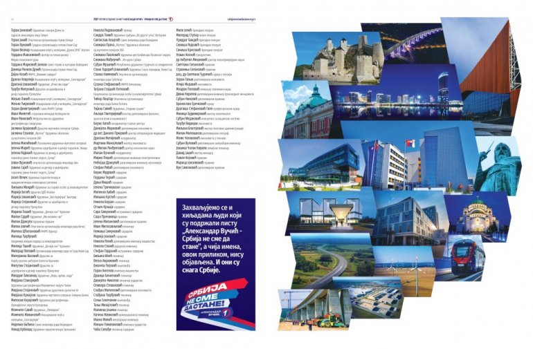 PREKO 2000 ljudi, među kojima su akademici, lekari, profesori, sportisti, glumci, potpisalo je podršku listi "Aleksandar Vučić - Srbija ne sme da stane"! Lista je objavljena u današnjim "Večernjim novostima".