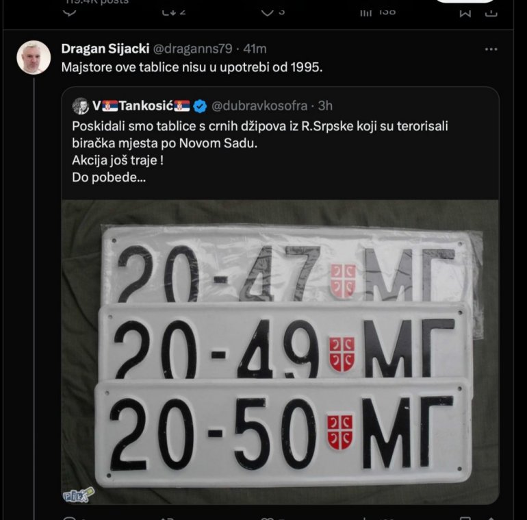 Tako se na platformi Iks pojavila fotografija na kojoj se vide tablice sa džipova iz Republike Srpske koji su "terorisali" biračka mesta po Novom Sadu. Da je reč o laži govori činjenica da te tablice nisu u upotrebi još od 1995. godine.