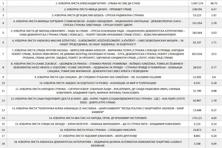 Lista Srbija protiv nasilja osvojila je 23,5 odsto glasova, Socijalistička partija Srbije - 6,57, izborna lista Nada za Srbiju ima 5,03 odsto, lista "Mi - glas iz naroda - Branimir Nestorović" - 4,69, a Milica Đurđević Stamenkovski - Boško Obradović 2,78 odsto glasova.
