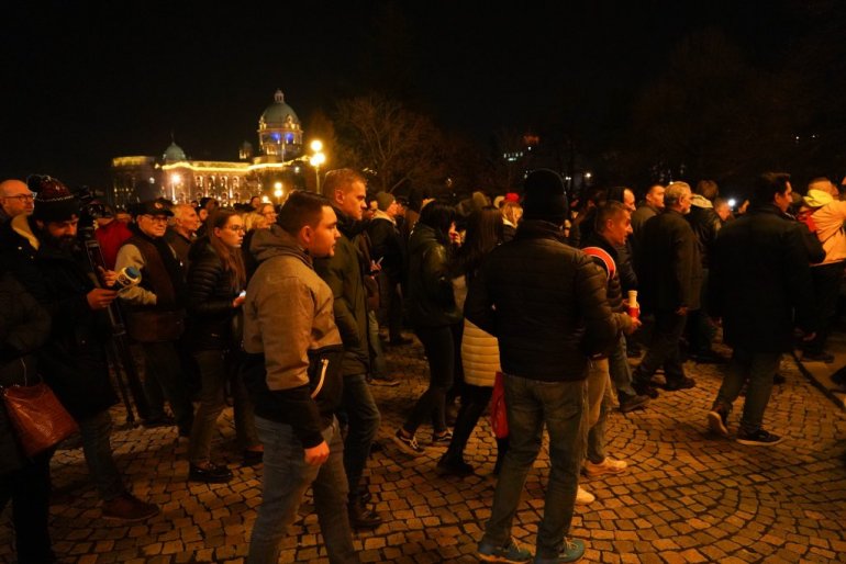 U 20:09 časova, na protestu ispred RIK-a, došlo je do kraćeg fizičkog sukoba među pojedinim učesnicima skupa koji su se međusobno pesničili i šutirali.