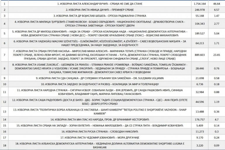 Izborna lista „Aleksandar Vučić - Srbija ne sme da stane” ima 46,64 odsto.