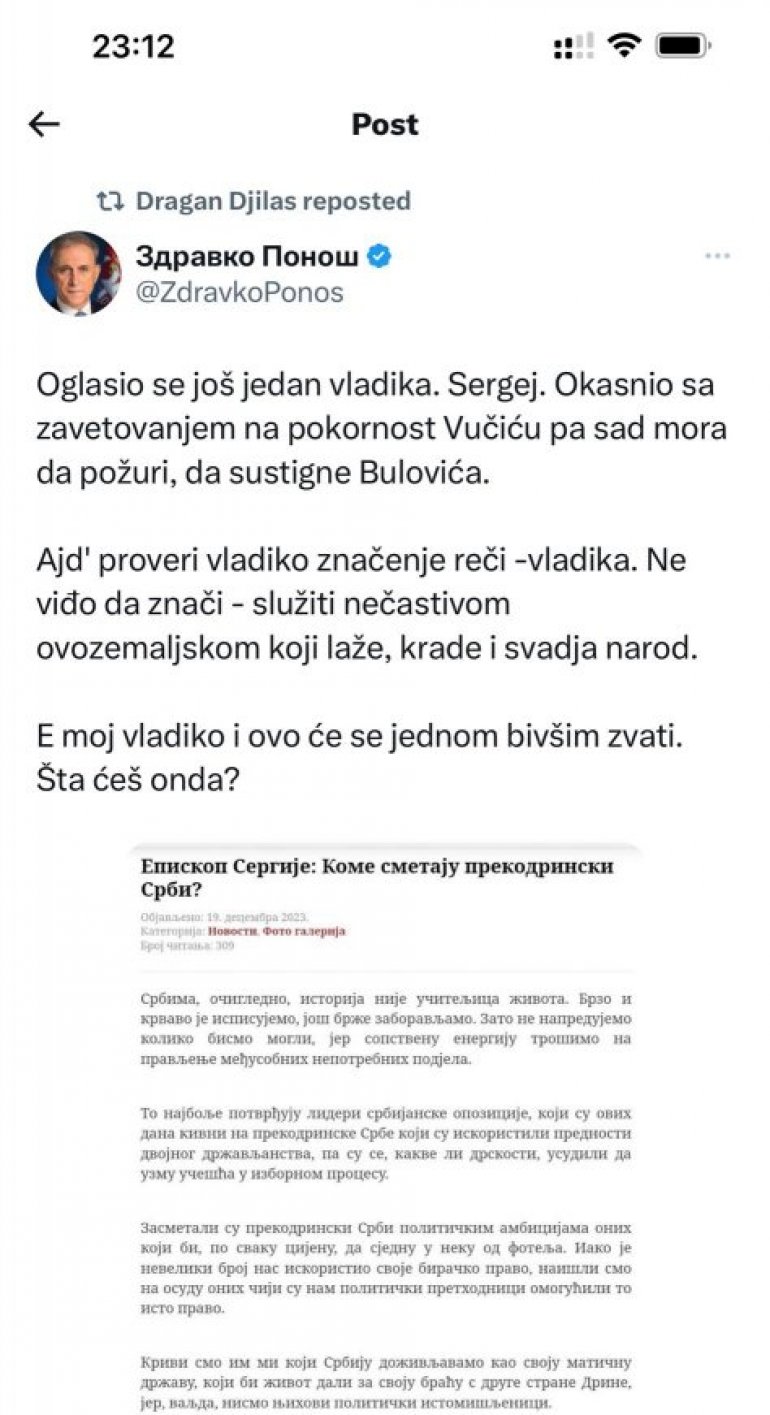 ZDRAVKO Ponoš iz koalicije Dragana Đilasa "Srbija protiv nasilja" sramno je na Tviteru izvređao vladiku Sergija zbog reagovanja na uvrede koje je opozicija uputila Srbima iz Repulike Srpske. Ponoševo vređanje vladike podržao je i Đilas, te podelio istu objavu.