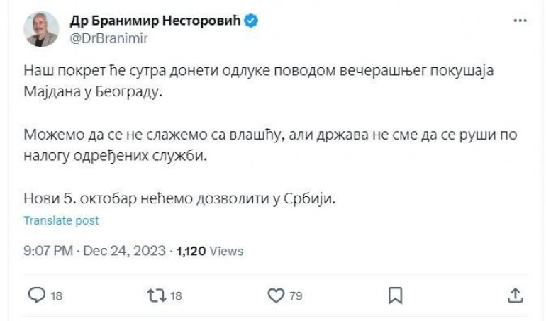 - Naš pokret će sutra doneti odluke povodom večerašnjeg pokušaja Majdana u Beogradu. Možemo da se ne slažemo sa vlašću, ali država ne sme da se ruši po nalogu određenih službi. Novi 5. oktobar nećemo dozvoliti u Srbiji.
