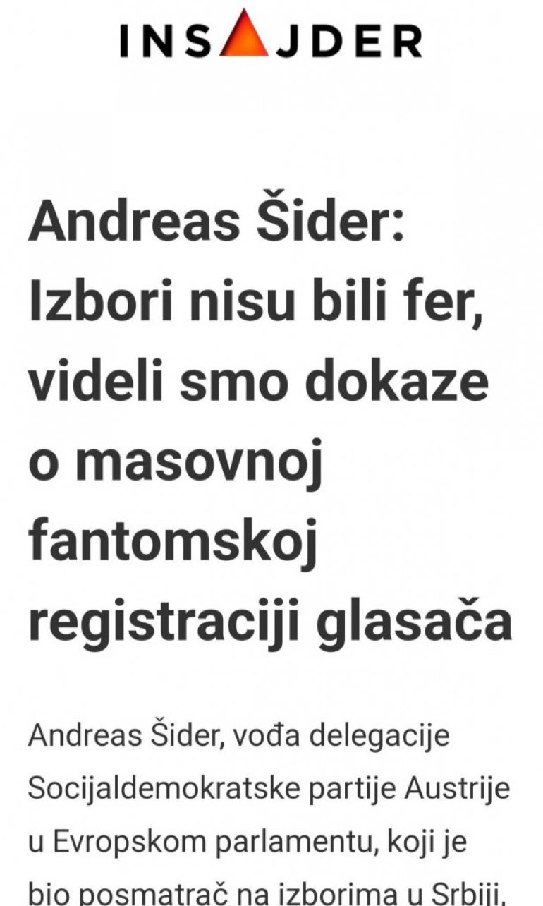 Posebno je zanimljivo što upravo oni koji se sada obrušavaju na navodno "mešanje u unutrašnja pitanja Srbije", od završetka izbora u medijima sebi naklonjenim citiraju i insistiraju na ispravnosti stavova i ocena Andreasa Šidera, iz Socijaldemokratske partije Austrije, čoveka čija je stranka opterećena brojnim aferama - od krađe glasova u sopstvenoj stranci pri izboru za predsednika, do korupcijskog skandala gde su ljudi iz njegove stranke optuženi za kupovinu poljoprivrednog zemljišta i malverzaciju sa cenama, i to samo zato što govori u korist opozicije. O svim pomenutim aferama pisali su relevantni austrijski mediji, a ovi tekstovi se mogu videti klikom na linkove iznad. Dakle, kada osoba koja je pokrala izbore u sopstvenoj stranci kaže nešto loše o Srbiji - za predstavnike "Srbije protiv nasilja" to je nešto poput svete knjige, što će se danima prenositi i ponavljati u njihovim medijima.