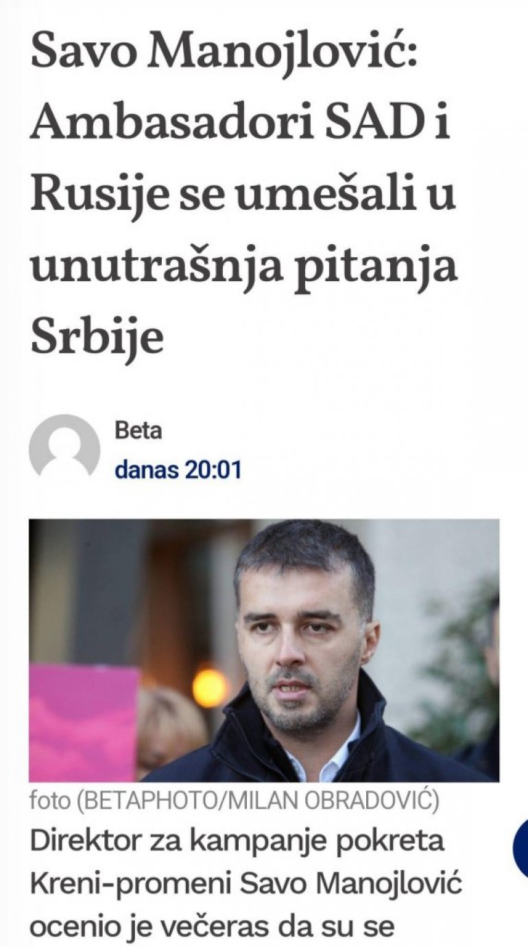 DIREKTOR za kampanje pokreta Kreni-promeni Savo Manojlović juče je napao ambasadore Amerike i Rusije u Beogradu, Kristofera Hila i Aleksandra Bocan-Harčenka. Kako ovaj predstavnik opozicije okupljene oko Dragana Đilasa i koalicije "Srbija protiv nasilja" tvrdi - osudom protesta opozicije i podrškom lideru vladajuće koalicije Aleksandru Vučiću – ambasadori su se umešali u unutrašnja pitanja Srbije.