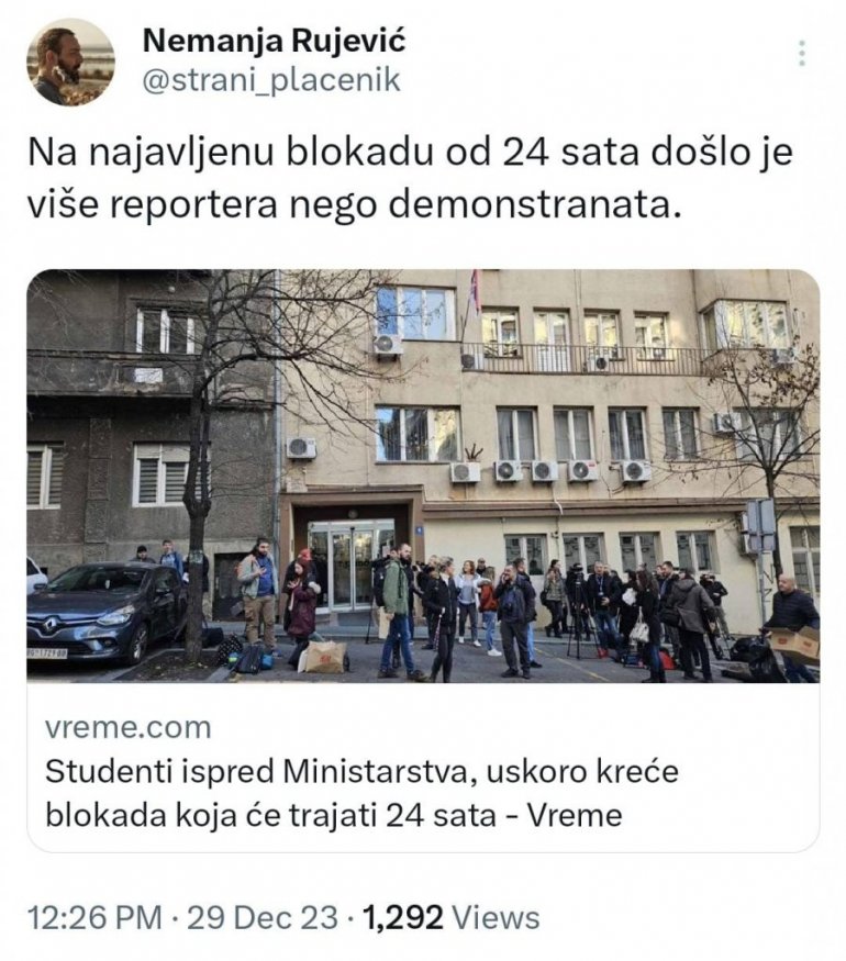 Posebno je zanimljivo da je na toliko najavljivanu blokadu došlo više reportera nego studenata, pa će njih, ako je sudeći po trenutnoj situaciji, 50 maltretirati ceo grad.