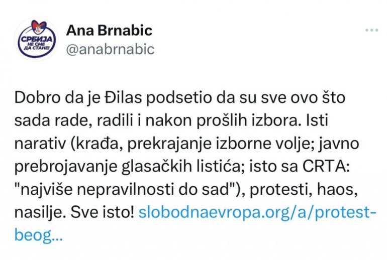 - Dobro da je Đilas podsetio da su sve ovo što sada rade, radili i nakon prošlih izbora. Isti narativ (krađa, prekrajanje izborne volje; javno prebrojavanje glasačkih listića; isto sa CRTA: "najviše nepravilnosti do sad"), protesti, haos, nasilje. Sve isto - objavila je Brnabićeva.
