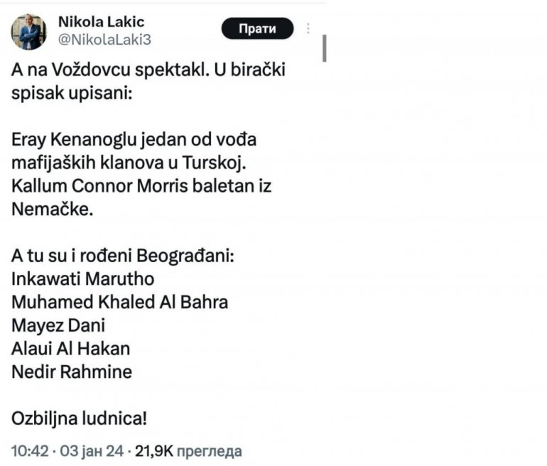 - A na Voždovcu spektakl: U Birački spisak upisani: Erej Kenanoglu, jedan od vođa mafijaških klanova u Turskoj, Kalum Konor Moris, baletan iz Nemačke. A tu su i rođeni Beograđani: Inkavati Maruto, Muhamed Kaled Al Bahra, Majez Dani, Alaui Al Hakan, Nedir Ramine - objavio je Lakić na platformi Iks, pokušavajući da kaže da je reč o nepostojećim glasačima.