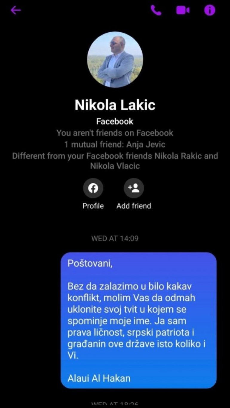 - Ja sam Srbin iračkog porekla, živim, radim i studiram u Beogradu, gde sam proveo veliku većinu života. Smatram da je na ovaj način pokušao da mi povredi ugled i čast i to na nacionalnoj, etničkoj, rasnoj, a možda i religijskoj osnovi. Moje se ime i prezime sad provlači po društvenim mrežama, odn. prezime mog brata i sestre, supruge i roditelja, koji zajedno sa mnom, a nemaju nikakve veze niti sa dotičnim, niti sa izborima - kaže Hakan.