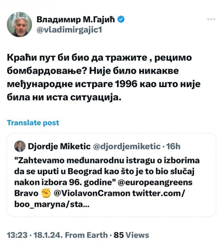 POTPREDSEDNIK Narodne stranke Vladimir Gajić komentarisao je objavu Đorđa Miketića na društvenoj reži Iks, u kojoj je napisao da zahteva međunarodnu istragu o izborima u Beogradu, kao što je to bio slučaj nakon izbora 1996. godine.