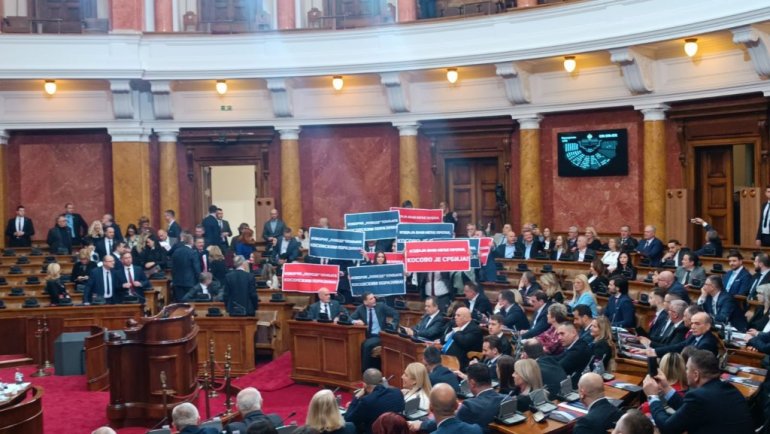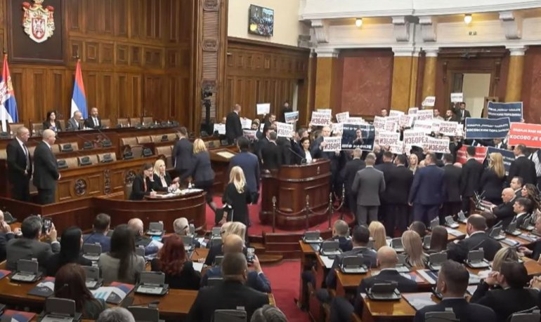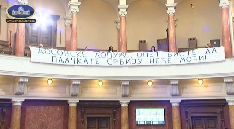 Poslanici liste Srbija protiv nasilja ustali su sa svojih poslaničkih mesta i razvili transparente "Pokrali ste izbore", " Poništite izbore", dok su poslanici koalicije Nada držali transparent "Kosovo je Srbija ", a zatim su uzvikivali "Vučiću, lopove".