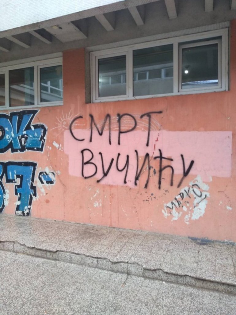 NA zidu Osnovne škole „Đuro Strugar“ u Bloku 37 na Novom Beogradu ispisani su jezivi grafiti kojima se upućuju pretnje predsedniku Srbije Aleksandru Vučiću.