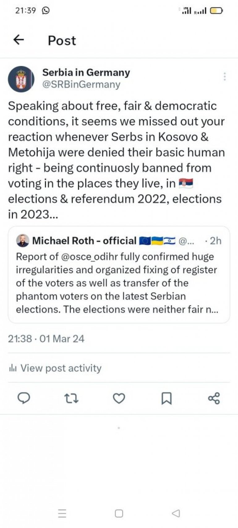 - Kada je reč o slobodnim, fer i demokratskim uslovima, izgleda da smo propustili vašu reakciju kad god je Srbima na Kosovu i Metohiji uskraćeno njihovo osnovno ljudsko pravo – neprekidna zabrana glasanja u mestu gde žive, srpski izbori i referendum 2022. godine, izbori 2023... -poručila je naša ambasadorka u Berlinu, Snežana Janković.