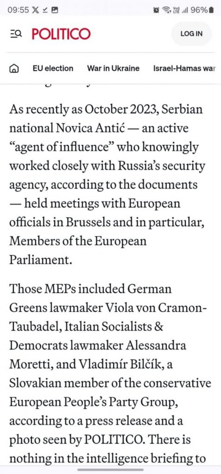 "Još u oktobru 2023, srpski državljanin Novica Antić — aktivni „agens uticaja“ koji je svesno blisko sarađivao sa ruskom bezbednosnom agencijom, prema dokumentima — održao je sastanke sa evropskim zvaničnicima u Briselu, a posebno sa poslanicima Evropskog parlamenta. Među tim poslanicima EP bili su nemačka poslanica Zelenih Viola fon Kramon-Taubadel, poslanica italijanskih socijalista i demokrata Alesandra Moreti i Vladimir Bilčik, slovački član Grupe konzervativne Evropske narodne partije, navodi se u saopštenju za štampu i fotografiji koju je POLITIKO video. U obaveštajnom brifingu nema ničega što bi sugerisalo da su Moreti, Bilčik i Fon Kramon-Taubadel znali za Antićeve veze sa FSB-om kada su se sreli sa njim", navodi "Politiko" o Antiću.