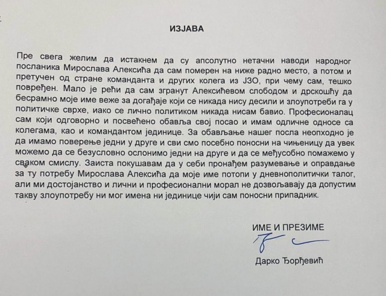 - Pre svega želim da istaknem da su apsolutno netačni navodi narodnog poslanika Miroslava Aleksića da sam pomeren na niže radno mesto, a potom i pretučen od strane komandanta i drugih kolega iz JZO, pri čemu sam, kako navodi, teško povređen. Malo je reći da sam zgranut Aleksićevom slobodom i drskošću da besramno moje ime veže za događaje koji se nikada nisu desili i zloupotrebi ga u političke svrhe, iako se lično politikom nikada nisam bavio.