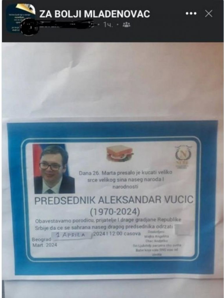 "NADLEŽNI DA KAZNE POČINIOCE" Mali o umrlici sa likom Vučića - Mržnja opozicije postaje sve strašnija i morbidnija
