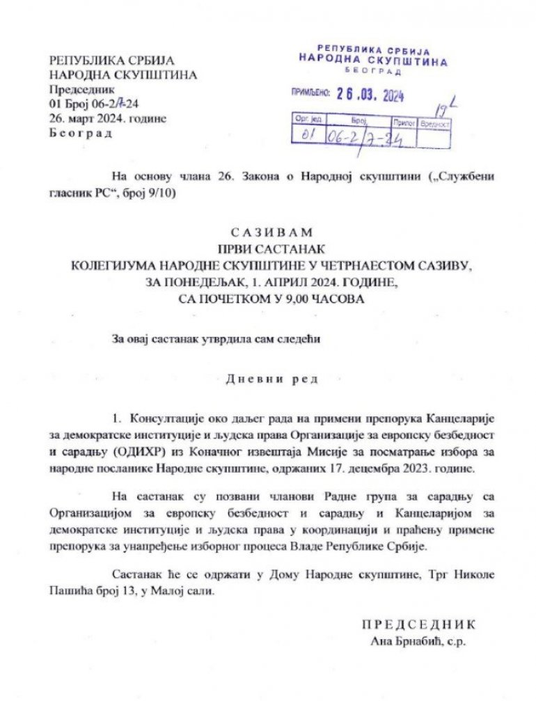 Kako je predviđeno sastanak će se održati u ponedjeljak 1. aprila 2024. godine sa početkom u 9 časova.