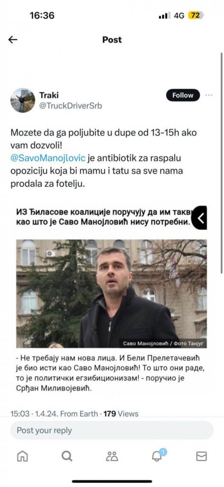 Simpatizer Save Manojlovića poručio je na Iksu Đilasovoj koaliciji: