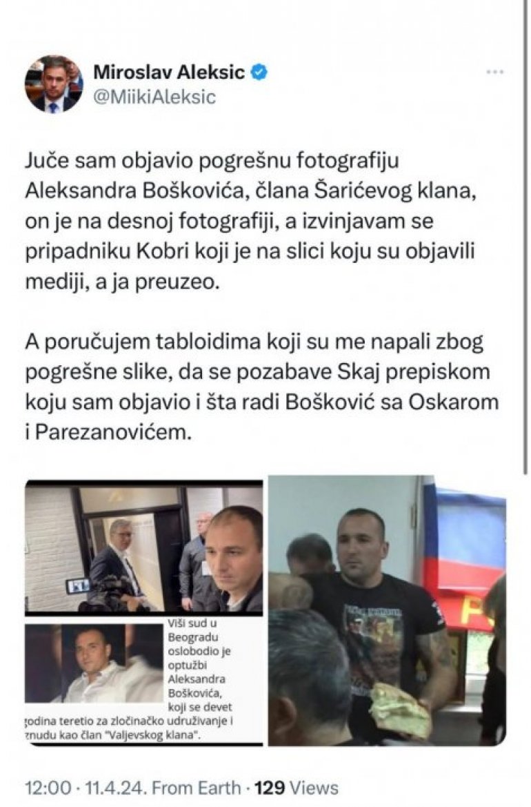MIROSLAV Aleksić objavio je sinoć na društvenoj mreži Iks da je Aleksandar Bošković bio u centrali SNS-a, uz Aleksandra Vučića. Ipak, Aleksić je tom objavom obmanuo i slagao javnost jer je na slici bio pripadnik Kobri Ninoslav Dimitrijević, častan pripadnik naše vojske.