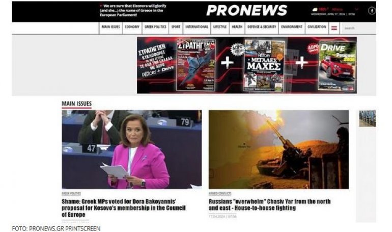 Popularni grčki Pronjuz (Pronews.gr) objavio je jutros na poziciji broj 1 na naslovnoj strani fotografiju Bakojanijeve i članak čiji naslov počinje rečju sramota.