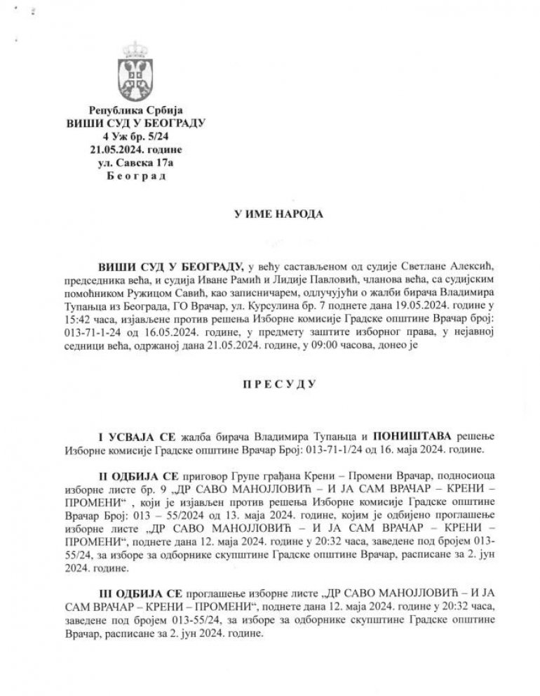 PO TUŽBI Vladimira Tupanjca iz CRTE oborena je lista Sava Manojlovića na Vračaru. Odluku o obaranju liste doneo je Viši sud u Beogradu.