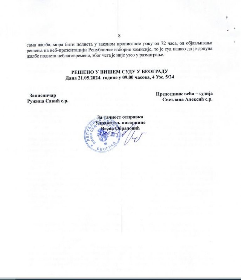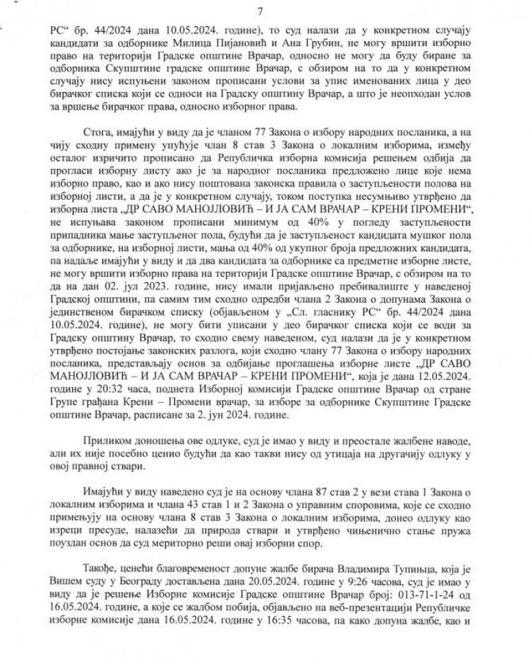 Kako je obrazložio Viši sud u Beogradu utvrđeno je da je za izbornu listu podneto 370 pravno valjanih pismenih izjava birača, a što predstavlja nedovoljan broj pismenih izjava za proglašenje izborne liste u navedenoj Gradskoj opštini. Za proglašenje izbrone liste po Zakonu o lokalnim izborima potrebno je da je svojim potpisom podrži 600 birača u jedinici lokalne samouprave.