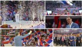 Dok se intonirala himna "Bože pravde", sa gornjeg prstena hale razvučene su srpske trobojke.